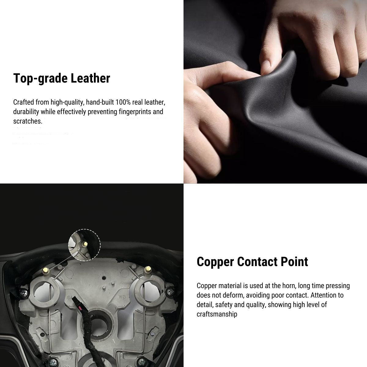- Top-grade Leather - Crafted from high-quality. hand-built 100% real leather. this steering wheel offers exceptional durability while effectively preventing fingerprints and scratches. The top-grade leather upholstery ensures a sleek finish without any concerns about air bag or deformation. ts economic design adds luxurious texture. providing a worry-free driving experience and comfortable handling.