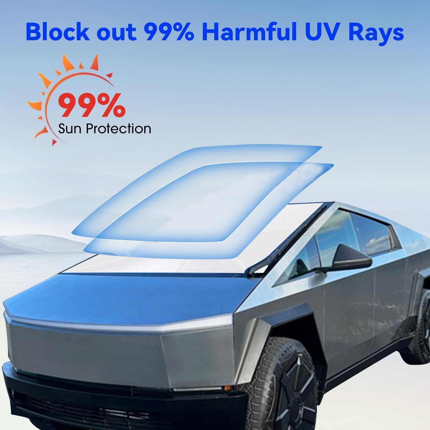 EFFECTIVE 99% UV PROTECTION: This windshield sun shade for Tesla Cybertruck features a thickened titanium silver coating, providing powerful shading and thermal insulation functions. It blocks and reflects 99% of UV rays, preventing the car's interior from cracking, fading, or aging due to prolonged exposure to high temperatures, and creates a cool and comfortable driving atmosphere.