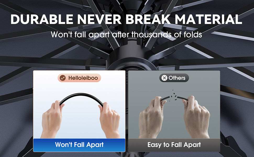 10 GLASS FIBER UMBRELLA FRAMEWORK: The sun shade's front windshield framework is made of durable glass fiber material. The robust skeleton and stable support ensure the longevity of this car umbrella, which can bend up to 90 degrees without breaking. It is lightweight and adaptable to fit different car windshields.